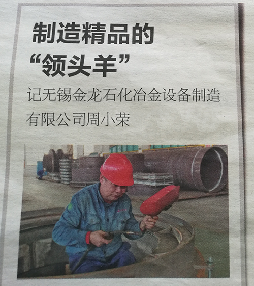 2018年8月27日本公司職工周小榮被評(píng)為制造精品的“領(lǐng)頭羊”. 多年來(lái)周小榮師傅作為公司補(bǔ)償器精品班長(zhǎng),帶領(lǐng)一班人,為公司承接制造大型、復(fù)雜、特殊用途和特種材料的補(bǔ)償器做出了貢獻(xiàn),是大家學(xué)習(xí)的榜樣。 詳見(jiàn)2018年8月27日江南晚報(bào)第七版。